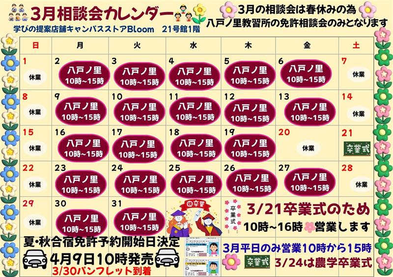 - 八尾柏原ドライビングスクール:【水】12:00~15:00(相談会カレンダーをご確認ください)